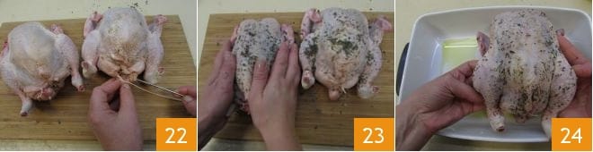 Use string to close the cockerels so that the stuffing doesn't come out 22 and gently massage them, sprinkling them with the remaining aromatic chop 23 so that the aromas stick well to the skin. Place the hens in a not too large baking dish where you have poured a little extra virgin olive oil 24