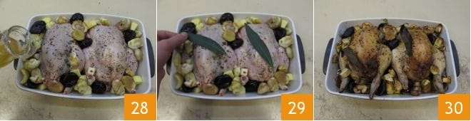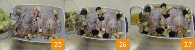 and the broth 28 and lay the bay leaves on the surface of the chickens 29. Bake at 392°F for about 80 minutes, making sure to occasionally baste the surface with the cooking juices, so the ingredients don't burn. Once cooked, you can serve the stuffed cockerel in fruit sauce piping hot 30.