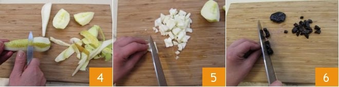 Peel the apple and pear 4 and cut them into cubes 5. Then chop 50 grams of prunes, which you can soften by soaking them in warm water for about ten minutes if they are too dry 6.