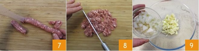 Finally, remove the casing from the sausages 7 and crumble them too 8. At this point, in a larger bowl, combine 100 grams of apple cubes and 150 grams of pear cubes 9,