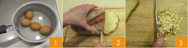 To prepare the stuffed eggs with fragrant breadcrumbs, first, place the whole eggs in a small pot filled with cold water and cook for 8 minutes after the water starts boiling 1. While the eggs are cooking, prepare the fragrant breadcrumbs: cut a slice from the loaf 2, divide it in half, and cut it into rather small cubes 3.
