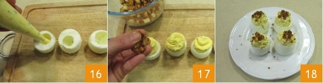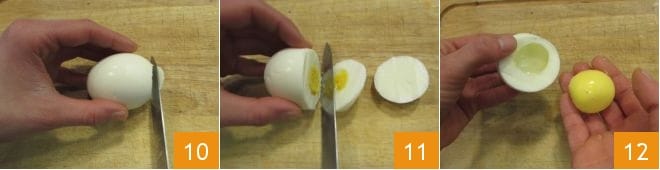 Once the eggs have cooled, carefully peel them, then cut a small piece of white off the lower end using a smooth-bladed knife 10; this way, the eggs will have a stable base. Also cut off the top end of the egg 11 and gently remove the yolk, being careful not to damage the white part you'll use as a container 12.
