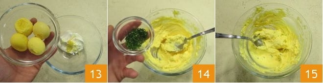 Add the yolks to the mascarpone and ginger mixture 13 and mix thoroughly with a spoon, then add a pinch of salt and the chopped chives 14 and mix again to obtain a smooth and uniform mixture 15.