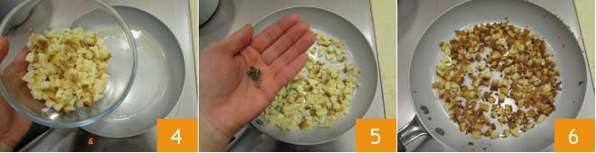 Heat a drizzle of oil in a non-stick pan, add the bread cubes 4, season with pepper and thyme leaves 5, and toast over low heat for a few minutes until the bread is well golden, making sure not to burn it 6.