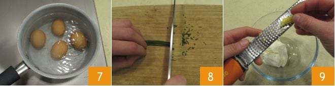 When the eggs are hard-boiled 7, drain and let them cool completely. In the meantime, you can prepare the ingredients for the filling: finely chop the chives 8, then pour the mascarpone into a bowl and add the freshly grated ginger 9.