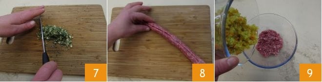 Finely chop the sage, garlic, and a sprig of rosemary 7. Take the sausage, cut it in half with a knife, and gently remove the casing with your fingers 8. Place it in a bowl, mash it with a fork, and add the now-cooled vegetables 9.