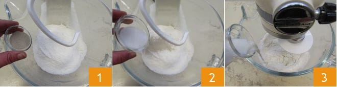 To prepare the stuffed pinched focaccia, start with the dough. In a stand mixer equipped with a dough hook, pour the sifted flour, dry yeast 1, and sugar 2, and start the mixer on low speed. Then add the milk and room temperature kefir milk in a thin stream 3.