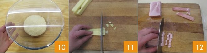 Place the dough in a large bowl and cover with clear plastic wrap 10. Let it rise for 4 hours in an off oven with the light on (at a temperature of 78-86°F maximum). Meanwhile, proceed with the preparation of the filling. Take the Emmental and Caciocavallo cheese and cut them into small cubes 11, repeating the operation with the cooked ham 12.