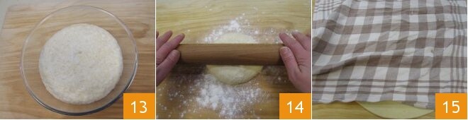 After the rising time, retrieve the dough that will have doubled in volume 13 and transfer it onto a slightly floured work surface; with a rolling pin, roll it out until you obtain a sheet with a thickness of approximately 0.2 inches 14. Then cover the dough sheet with a clean cloth and let it rest for 10 minutes 15. This operation is necessary to prevent the dough from retracting when cutting immediately.