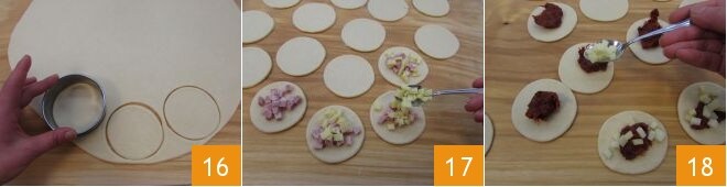 Create dough discs using a pastry cutter with a diameter of 3 inches 16. The leftover dough can be reused to obtain further discs. You can fill half of the obtained discs with ham and Emmental cubes 17 and the other half with a teaspoon of 'nduja and Caciocavallo cubes 18, being careful to leave a border space to avoid the filling spilling out during cooking.