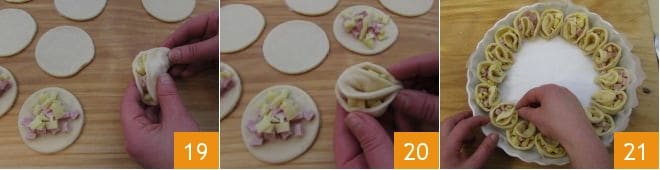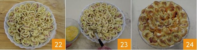 Take one disc and fold it in half to obtain a half-moon shape 19, then bring the ends of the half-moon to the center to give the shape of a small rose 20. Press the ends firmly with your fingers to seal the dough. Repeat the operation with all the discs. Then take a pan with a diameter of 12.5 inches and line it with parchment paper. Arrange the stuffed roses in the pan, starting from the edges 21 and alternating the different fillings.