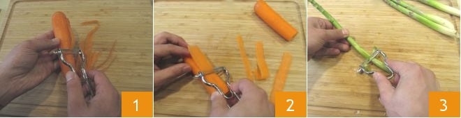 To prepare the stuffed pork loin, start by dealing with the vegetables. Use a peeler to scrape off the outer layer of the carrots 1 and then use the same tool to create thin strips of carrot 2. Also peel the asparagus stalks, removing the hard and woody part 3.