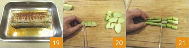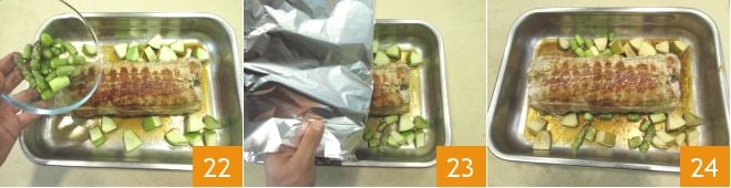 Add the apple cubes and chopped asparagus around the roast in the dish 22, and finally cover with a sheet of aluminum foil 23. Bake the stuffed pork loin in a preheated static oven at 392°F and cook for 50 minutes (or in a fan oven at 356°F for about 40 minutes). Your dish is ready! 24.