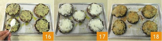 and sprinkle the surface with grated Pecorino cheese (16-17), then add a final grind of pepper. Bake in a preheated static oven at 392°F for 25 minutes, then turn on the grill and bake for another 5 minutes. Your stuffed portobello mushrooms are ready to be enjoyed 18!