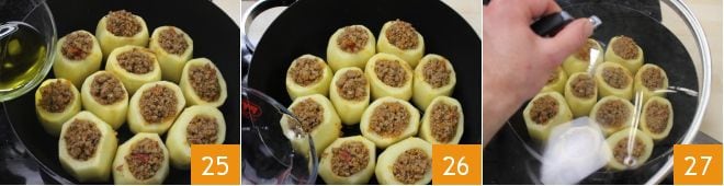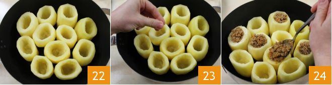 At this point, you can drain the potatoes, dry them with paper towels, and place them side by side in a wide pan, also suitable for oven cooking 22. Salt them inside one by one 23 and fill them with the ragù to the brim 24; 2-3 tablespoons per potato will be enough.