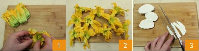 To make the zucchini flowers stuffed with speck and mozzarella, take the zucchini flowers: wash them gently and dry them by patting them with paper towels. The flowers will need to be whole, so remove the growths, the stem, and the stalk 1 while keeping the bottom cup intact to prevent the stuffing from coming out. Gently spread them open and place them on a cutting board 2. In the meantime, prepare the filling: cut the mozzarella into sticks 3.