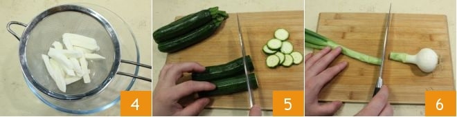 Place them to drain in a sieve 4 so they don't release water during cooking. Wash the zucchini and cut them into rounds 5, wash the scallion, and finely slice the white part 6.