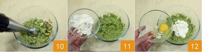 Transfer everything to a tall-sided bowl, blend with an immersion mixer 10 just enough to get a creamy and homogeneous mixture, then add the ricotta 11, the egg 12.
