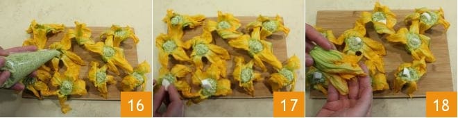 Fill the zucchini flowers with the mixture 16, placing a mozzarella stick in the center 17, then close the flowers well by twisting the tips 18.