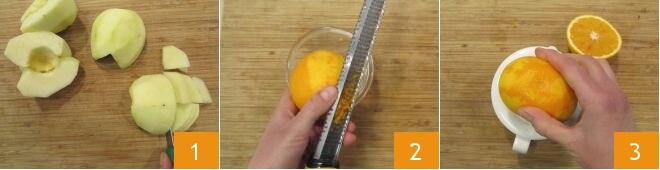 To prepare the sugar-free mini plumcakes, first wash the apples, then set aside half covered with plastic wrap for the final decoration. Peel and slice the remaining apples into slices about 1/8 inch thick 1 and place them in a large bowl. Grate the zest of an untreated orange and set aside 2; then squeeze the juice from this grated orange and another one 3.
