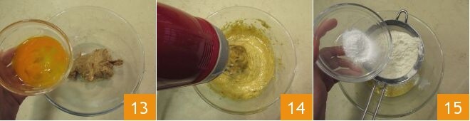 Transfer the obtained cream into a bowl, add the egg 13, a pinch of salt, and mix with electric beaters 14. Sift the flour and baking powder into the bowl 15