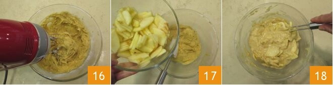 and continue mixing the batter with electric beaters to combine everything 16. At this point, add the apple slices flavored with orange juice 17 and incorporate them into the batter by mixing with a spatula 18.