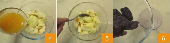 From the squeezed orange juice, use 3.5 oz for the batter by pouring it into the bowl with the apple slices 4 and set aside the remaining juice: it will be used to brush the plumcakes once baked. Mix the apples well with the orange juice 5 and set aside. Place the pitted dates in a tall, narrow container 6,