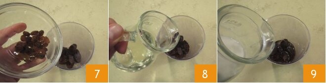 add the previously washed raisins 7, the vegetable oil 8, the milk 9