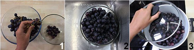 To prepare grape sugoli, start by destemming the grapes 1, then rinse them well under running water 2. Place the grapes in a large pot, cover it with a lid 3, and cook them over low heat for 2-3 minutes.