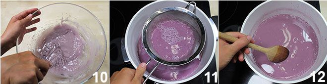 vigorously mixing with a whisk to prevent lumps in the sugoli mixture 10. Strain the rather liquid mixture obtained to eliminate any lumps and transfer it to a saucepan 11. Cook over low heat and, stirring occasionally 12, bring to a boil.