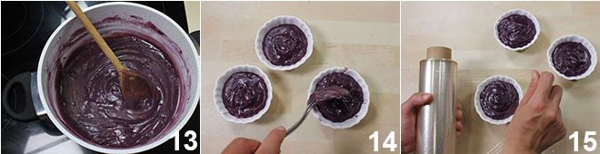 Once the mixture has thickened and reached a nice purple color 13, turn off the heat and divide the mixture into 6 ceramic molds (or silicone or aluminum) with a capacity of about 3.5 oz each 14. Cover the sugoli with plastic wrap 15 and let them set in the refrigerator for at least an hour. Your grape sugoli are ready to be enjoyed!