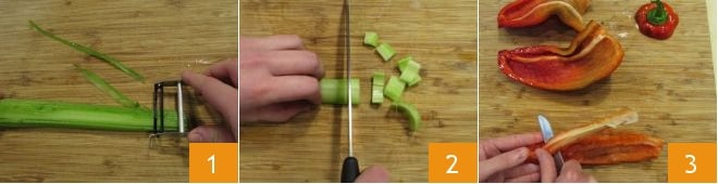 To make the gazpacho, start by washing the vegetables and strawberries. Then peel the celery to remove the outer fibrous part of the stalk 1, then cut it into pieces 1. Quarter the bell pepper, remove the stem and extract the internal seeds 3