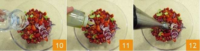 add a little water if needed, to make the mixture creamier 10, season with salt, pepper, oil 11 and blend everything with an immersion blender 12.