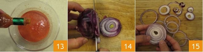 Once a smooth and velvety consistency is obtained, season with a few drops of Tabasco 13, adjust salt and pepper, cover with plastic wrap and set aside in the refrigerator. Now move on to preparing the battered onions: peel the red onion, slice it to obtain rings about 1/5 inch thick 14, separate the rings 15.