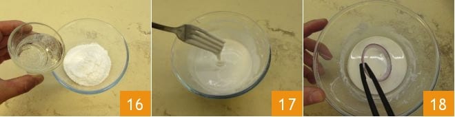 Prepare a batter by mixing rice flour with sparkling water 16, stir to obtain a smooth mixture 17. Move on to frying the rings: heat the seed oil in a pan and when it has reached 340°F, dip each ring first in the batter 18
