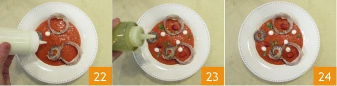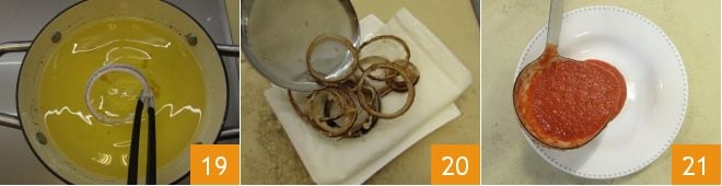 and then in the hot oil 19, cook until golden, it will only take a few moments, drain with a slotted spoon and place the rings on a tray lined with paper towels 20; then lightly salt them. You can then plate: pour the gazpacho into a deep plate 21