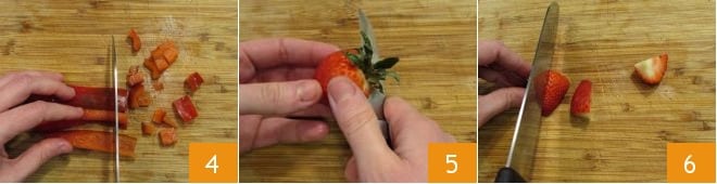 then cut it into cubes 4. Remove the leaves from the strawberries 5 and cut them into pieces as well 6