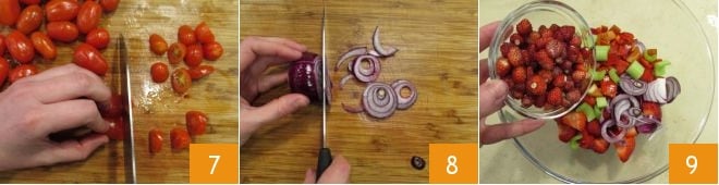 move on to the cherry tomatoes and cut them in half 7, peel the red onion and slice it coarsely 8. Transfer everything into a bowl, add the wild strawberries 9
