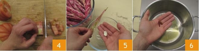 Wash the tomatoes, cut them into slices and then into cubes 4. Finally, shell the fresh beans 5. Once the vegetables are ready, you can proceed to cooking: heat the oil in a large pan, flavor with the chili pepper for a few moments 6.