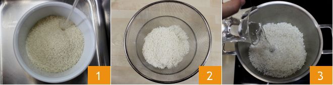 To prepare Italian-style sushi, start by preparing the rice (you can consult the detailed procedure in the sushi card): we used 1 cup of raw rice (small and round grains) which will double in weight once cooked. Rinse the rice under cold running water 1: do at least ten rinses, moving the rice with your hands until the water becomes clear. Leave the rice to soak for 15 minutes, then drain it 2 and let it rest for another 15 minutes in the colander. After this time, place the rice in a not-too-wide pot and cover it completely with water 3.