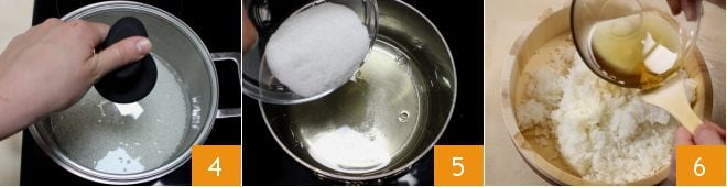 Cover the rice with a lid 4, cook over medium heat to bring to a boil. Do not open the lid until you hear boiling. At that point, boil for 8-10 minutes, then lower the heat and cook over low heat for another 8-10 minutes. After this time, turn off the heat and let it rest with the lid on for at least 10 minutes. Meanwhile, prepare the seasoning: pour the rice vinegar into a saucepan, add the sugar 5, the salt, and heat everything to dissolve the sugar, stirring occasionally without bringing to a boil. Turn off the heat and let cool. When the rice has rested for the indicated time, transfer it to the hangiri (or a shallow, wide container), take a wooden ladle (preferably a shamoji, a flat, rounded spatula) and, holding it over the rice, pour the now cold rice vinegar mixture 6 over it, so that it drizzles over and is better distributed. Gently move the rice with the spatula using a cutting motion, to avoid crushing it, and fan it simultaneously with a plastic plate to cool it quickly and evaporate the vinegar. Once cooled, cover it with a clean cloth until ready to use to prevent drying out.