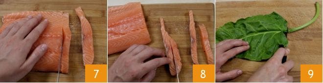 Then proceed to prepare the sushi: rinse under running water and dry with kitchen paper the salmon fillet, already deboned (alternatively, you can use 1.7 oz of salmon and 1.7 oz of fresh tuna). Then place it on a cutting board and cut slices about 0.4 inches thick 7, then divide them in half to create strips 8. Then rinse under running water the chard leaves one by one. Then cut off the stem 9.