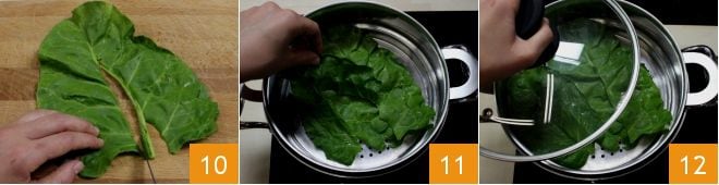 Then remove the central rib 10. Take a steamer and heat the water, then add the basket. When the basket is also well-heated, place the chard leaves inside 11 and then cover with the lid 12 to steam the leaves for about 2-3 minutes (if you don't have a steamer, you can use a pot and replace the basket with an aluminum colander).