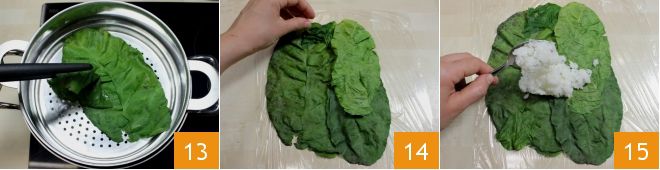 Turn the leaves over halfway through cooking using kitchen tongs 13, then turn off the heat. On a surface, place rectangles of plastic wrap, then with the warm chard leaves form squares about 7 inches on each side 14, placing them slightly overlapping. Then add about 1 cup of rice in the center 15.