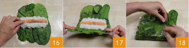 Distribute the rice in the center of the leaves, creating a rectangle and leaving about 0.4 inches of space on the sides. On top of the rice, place a strip of salmon 16. Take the edges of the plastic wrap and lift them 17 to fold the leaves over the filling. Then remove the wrap from the folded part, holding the leaves with your fingers 18.