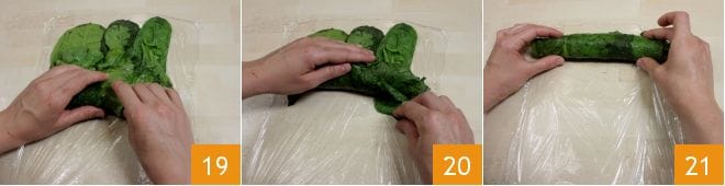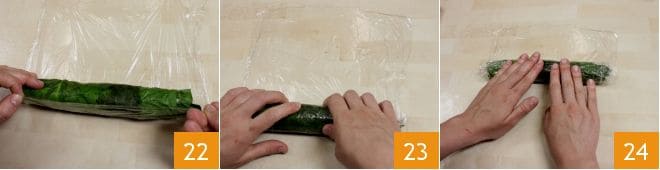 Now gently bring the roll back to the beginning of the plastic wrap 22 and wrap it, rolling it gradually with the latter (23-24).