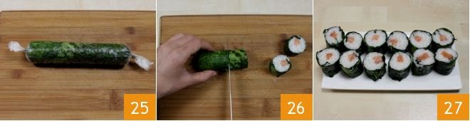 Seal the plastic wrap by twisting the ends like candy 25 and let the sushi rest in the refrigerator for 1 or 2 hours. After the indicated time, remove the plastic wrap. Before cutting the sushi, wet the knife blade with acidulated water. This is because the cooked rice is very sticky and tends to adhere. Then cut rolls of 0.8 inches in length 26. Store the Italian-style sushi in the refrigerator until ready to serve. You can present the Italian-style sushi on a serving plate 27 and accompany it with soy sauce or pickled ginger!