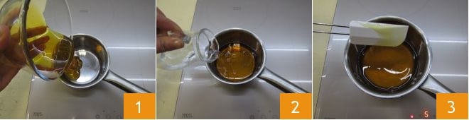 To prepare the susumelle, start by pouring the honey into a small pot 1, add the water 2, and heat it gently over low heat 3, just enough time to melt it.