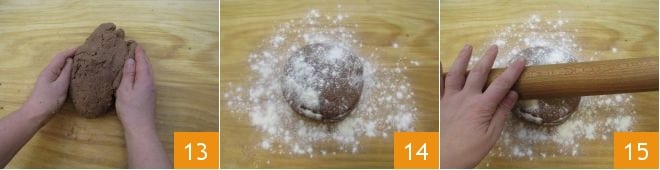 At this point, transfer it to a surface 13, dust with a little flour 14, and roll it out with a rolling pin 15