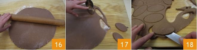 until you get a thickness of about 0.4 inches 16. Using an oval cookie cutter about 3.5 inches long, cut out your cookies 17 and gently lift them using a spatula 18.